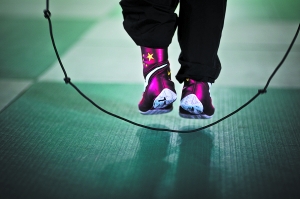 受者试将绳的长短调至适宜长度,听到电子仪器发出开始信号后开始跳绳,动作规格为正摇双脚跳绳,每跳跃一次且摇绳一回环(一周圈)为一次。听到电子仪器发出结束信号后停止,电子仪器自动计数受试者在1分钟内完成跳绳次数并记录储存成绩...